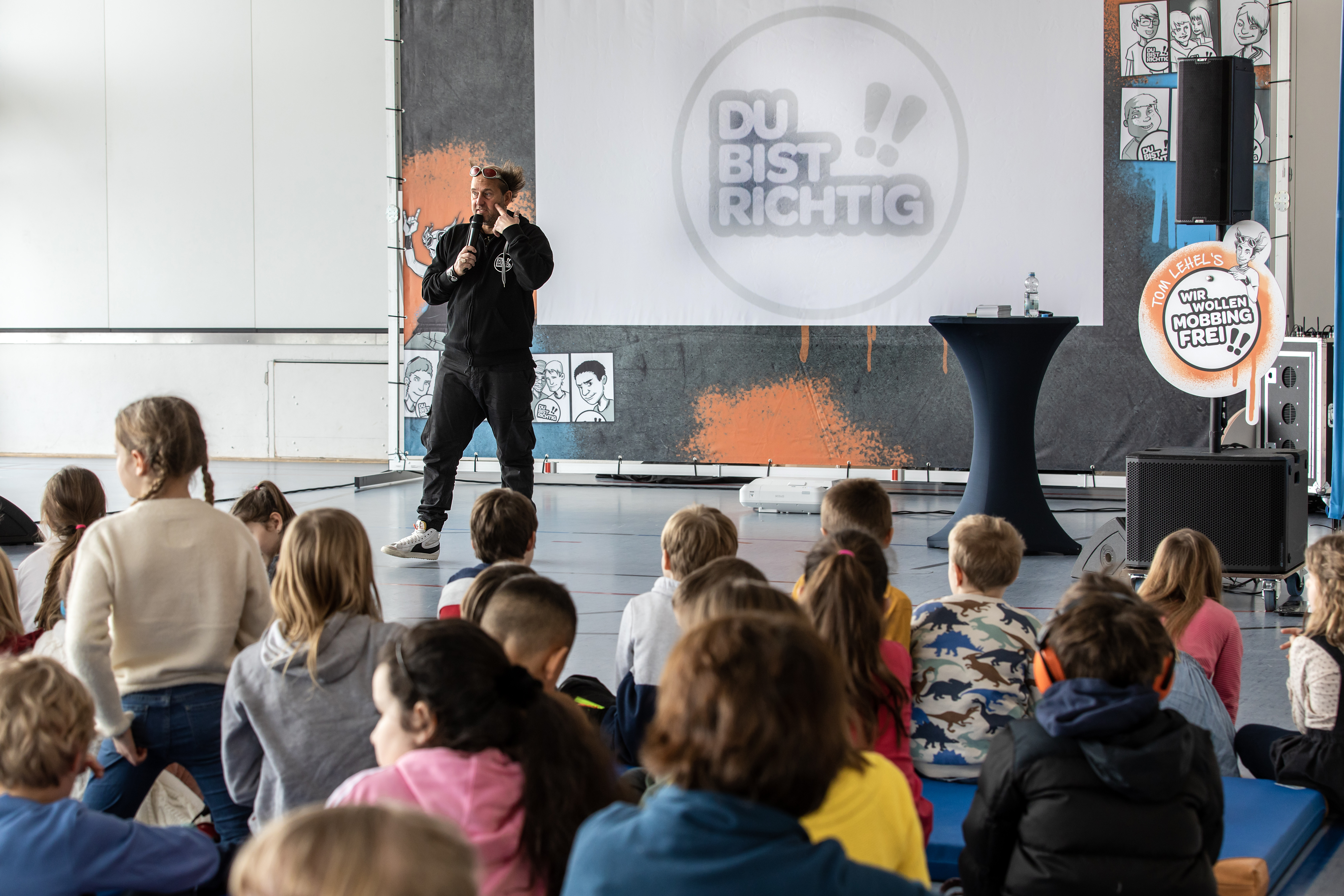 Moderator Lehel liegt die Thematik persönlich am Herzen, nicht zuletzt wegen seiner eigenen Erfahrungen. Dies spiegelte sich auch in seinem Vortrag wider, mit dem er die 80 neugierigen Kinder aus der zweiten bis vierten Klasse begrüßte. In der Turnhalle der Schule entstand schnell eine angenehme Atmosphäre und die Kinder hingen gebannt an Lehels Lippen, als dieser Ausschnitte aus seinen Anti-Mobbing-Büchern vorlas.