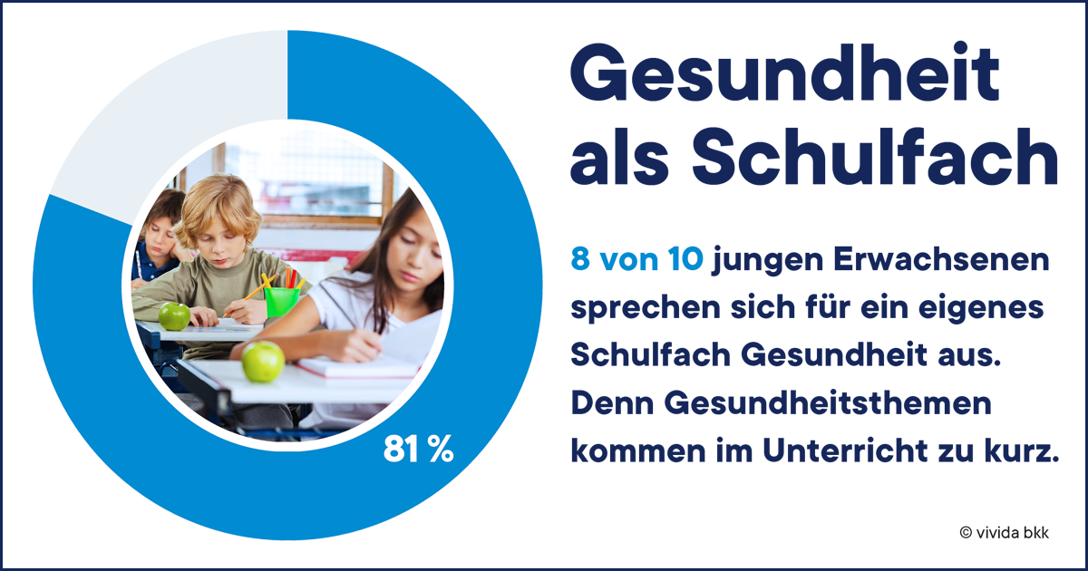 81 Prozent der jungen Bundesbürger sind der Meinung, dass Gesundheit als eigenes Schulfach unterrichtet werden sollte. Außerdem sind 64 Prozent für die Einführung einer Schulgesundheitsfachkraft. Diese berät bei gesundheitlichen Fragen, unterstützt bei der Erstversorgung und fördert die Gesundheitskompetenz der Schülerinnen und Schüler.