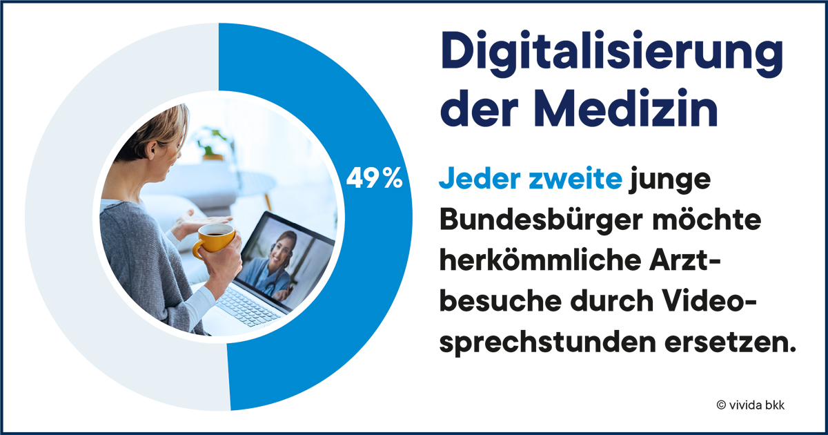 Villingen-Schwenningen –Die Digitalisierung der Medizin sehen Jugendliche und junge Erwachsene positiv. So möchte jeder Zweite der 14- bis 34-Jährigen herkömmliche Arztbesuche durch Videosprechstunden ersetzen. Das ist ein Ergebnis der Studie „Zukunft Gesundheit 2020“ der vivida bkk und der Stiftung „Die Gesundarbeiter“. Für die Studie wurden im August 2020 in Deutschland über 1.000 Jugendliche und junge Erwachsene zwischen 14 und 34 Jahren befragt.