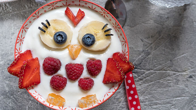 Dabei braucht man all den Zucker im Joghurt gar nicht. Ich mach das jetzt immer anders. Ich mische mir aus Naturjoghurt und Obst meinen eigenen Fruchtjoghurt. Das ist total einfach. Ich schneide Obst klein und rühre es in den Naturjoghurt. Das schmeckt mir sogar viel besser als der fertige Fruchtjoghurt aus dem Supermarkt.